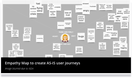 Misalignment kills products before bad design does. I use journey maps, vision artifacts, and workshop facilitation to create a single shared model across PM, engineering, and leadership. At Docker I reduced 10 competing PRDs to 5 prioritised initiatives in a single quarter through structured empathy mapping. Alignment is a design deliverable.