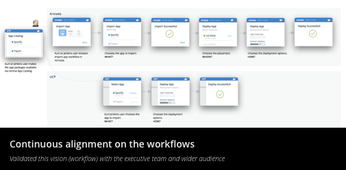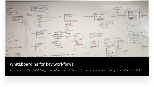 We then worked iteratively with PM, engineering team to whiteboard 50K ft. overview of proposed end to end workflow. From this end to end workflow, we scoped out the key workflows for the cluster federation work. From this scoped work, we distributed our tasks within the design team, and I started focusing on the key workflow of bringing the app into federated cluster view and monitoring these clusters at a high level. I iterated on a higher fidelity version of the information architecture in order to align geographically distributed teams.