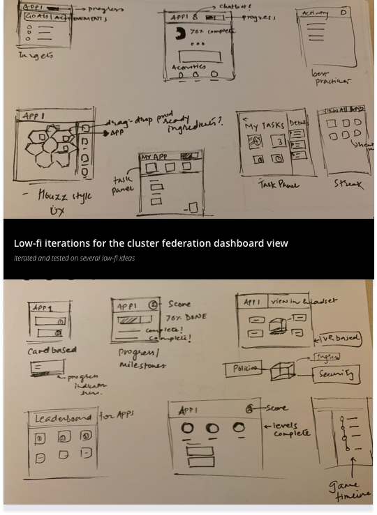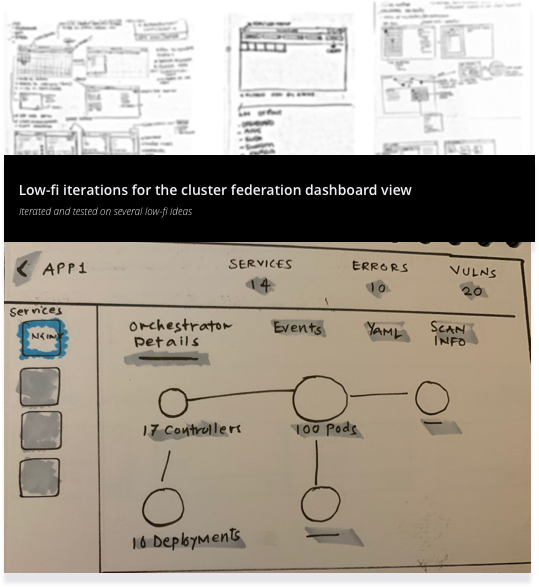 I iterated on several key pieces of the workflow in low-fidelity to get alignment from the stakeholders (tech and PM teams). I tried several mental models to represent different view of the complex workflows involved in monitoring clusters and bringing the app into a federation layer.